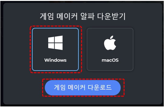 2. 메인 베너에서 [다운로드] - [원도우/맥] 선택 - [게임 메이터 다운로드]